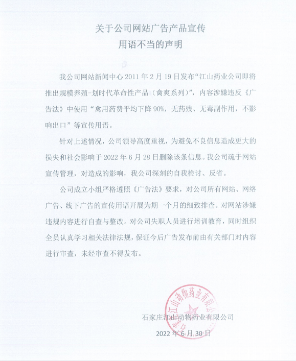 我公司網站新聞中心2011年2月19日發布“江山藥業公司即將推出規模養殖-劃時代革命性產品(禽爽系列)”,內容涉嫌違反《廣告法》中使用“禽用藥費平均下降90%,無藥殘、無毒副作用,不影響出口”等宣傳用語。